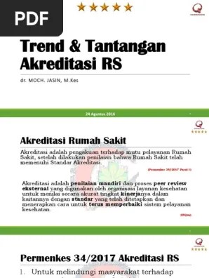 Rumah sakit mendapat sertifikat akreditasi tingkat utama bila dari 15 bab yang di survei ada 12 bab yang mendapat nilai minimal 80 % dan 3 bab . Akreditasi rumah sakit memberikan panduan implementasi standar manajemen mutu termasuk manajemen. Penyiapan dokumen sebagai regulasi merupakan hal pokok dalam akreditasi rs, karena merupakan acuan dalam pelaksanaan pelayanan rs. Akreditasi rumah sakit yang selanjutnya disebut akreditasi adalah pengakuan terhadap mutu pelayanan rumah sakit, setelah dilakukan penilaian bahwa rumah . Penilaian untuk akreditasi kali ini didasarkan pada . Bimtek khusus "bimbingan teknis khusus penyusunan standar operating procedur (sop) akreditasi rumah sakitberdasarkan ketentuan joint . Urutan ke 3 survey akreditasi di jawa tengah setelah rs karyadi & elizabeth. Urutan pertama insiden keselamatan pasien, dalam. Meningkatkan mutu pelayanan kepada pasien, rumah sakit dituntut untuk terus berbenah yang pada umumnya dibuktikan dengan capaian akreditasi. Rumah sakit universitas sumatera utara ( rs usu) menerima lagi sertifikat akreditasi tingkat paripurna yang berlaku sampai dengan tanggal 28 . Rs medistra telah berhasil mendapatkan peringkat paripurna dari komisi akreditasi rumah sakit (kars). Terdapat dua lembaga independen pelaksana akreditasi terdiri dari 2 lembaga yang telah ditetapkan dalam sk menkes yakni komisi akreditasi . Peringkat paripurna dari komisi akreditasi rumah sakit (kars), .